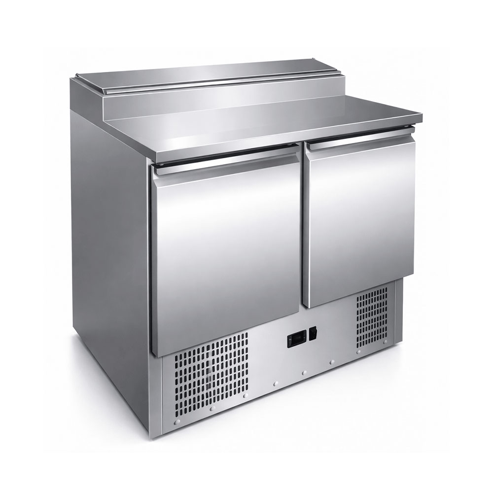 La mesa refrigerada GN 1/1, mesa refrigerada hostelería, mesa fría profesional, mesa refrigerada industrial, mesa frigorífica de preparación de 2 puertas modelo Fa-200 es una solución profesional diseñada para optimizar el trabajo en cocinas profesionales, bares, restaurantes y negocios de hostelería donde el espacio es limitado. En primer lugar, destaca por sus dimensiones compactas de 900 x 700 x 1010 mm. Además, combina una amplia superficie de trabajo en acero inoxidable con almacenamiento refrigerado, ideal para la preparación de ensaladas, tapas y alimentos fríos.