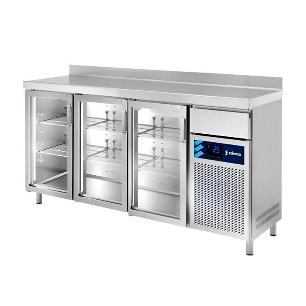 El modelo con puerta de cristal (PC) también incorpora doble acristalamiento. En el acabado negro, incluye doble iluminación interior, mejorando la visibilidad del producto refrigerado. Todos los modelos cuentan con un cajón neutro auxiliar, que puede reemplazarse por un cajón tolva bajo pedido. La temperatura de trabajo va de -2° a +8° C, con un ambiente de hasta 30 °C. Es decir, garantiza la conservación óptima de alimentos frescos.