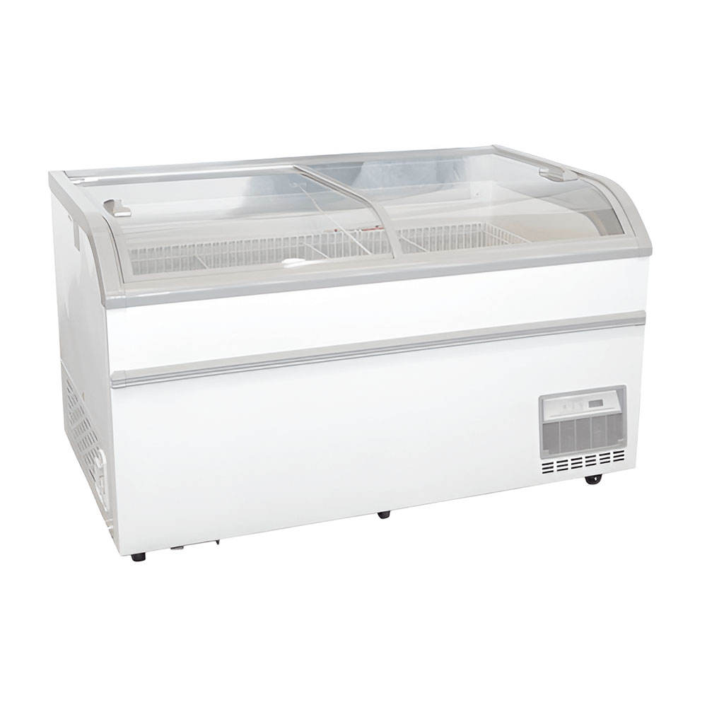 La isla incorpora puertas de cristal curvo templado con marco calefactado. Incluye tecnología e-glass para reducir la pérdida de frío. Además, la iluminación LED interior ofrece una luz homogénea. Esto mejora la visibilidad del producto y realza su presentación.