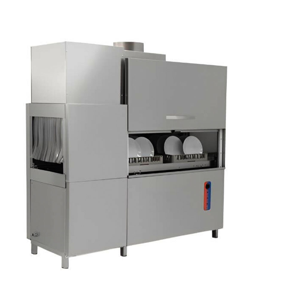 Las cubas totalmente estampadas y las cámaras de lavado sin tubos internos facilitan la limpieza y el mantenimiento. Es decir, se evita la acumulación de residuos y se mejora la higiene. Después, el sistema de arrastre de cestas mediante guías laterales garantiza un flujo continuo y estable durante todo el lavado.