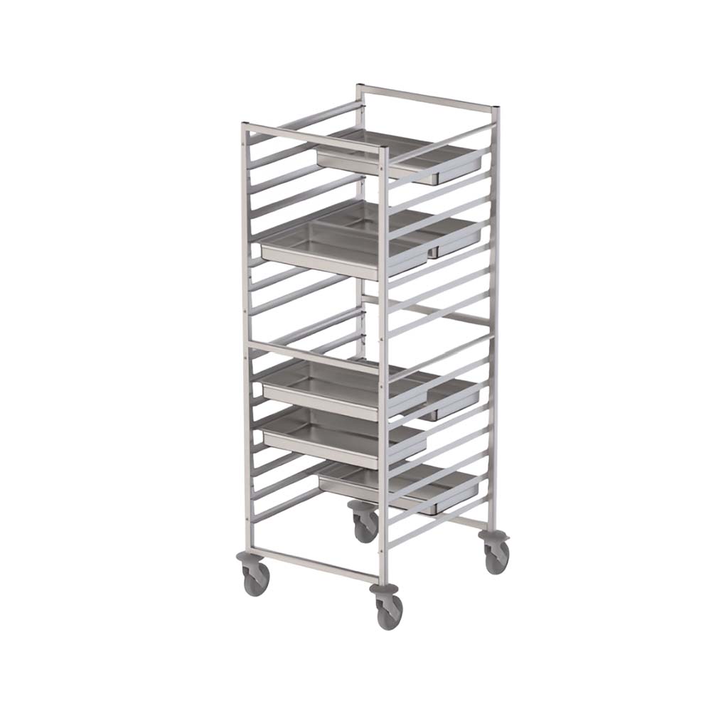 Fabricado en acero inoxidable de alta calidad, el carro para bandejas GN garantiza resistencia a la corrosión y larga vida útil, principalmente en entornos de alta exigencia. Además, su estructura robusta permite almacenar y transportar hasta 32 bandejas GN1/1 y 16 bandejas GN2/1, optimizando el espacio en la cocina profesional. Con dimensiones de 460 x 640 x 900 mm, es compacto, pero lo suficientemente espacioso para adaptarse a cualquier estándar de la industria de la restauración.