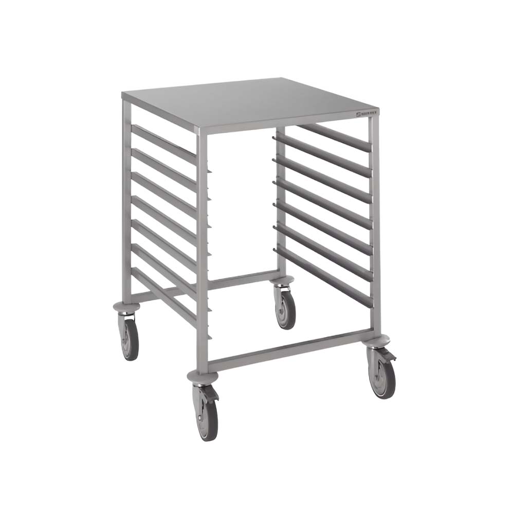 Su estructura soldada en tubo cuadrado de 25 × 25 × 1.2 mm proporciona gran estabilidad y seguridad. Además, las guías en “C” de acero inoxidable cuentan con un tope trasero, lo que impide el deslizamiento de las bandejas. Es decir, ofrecen un transporte seguro, higiénico y eficiente para recipientes Gastronorm.