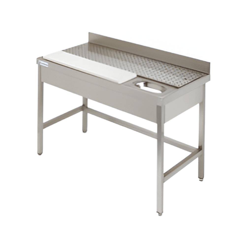 Incluye una tabla de corte de polietileno de 20 mm de grosor, resistente y apta para el contacto directo con alimentos. Además, incorpora un orificio para la eliminación de residuos, lo que permite agilizar el trabajo y mejorar la organización en la preparación de carne y pescado.