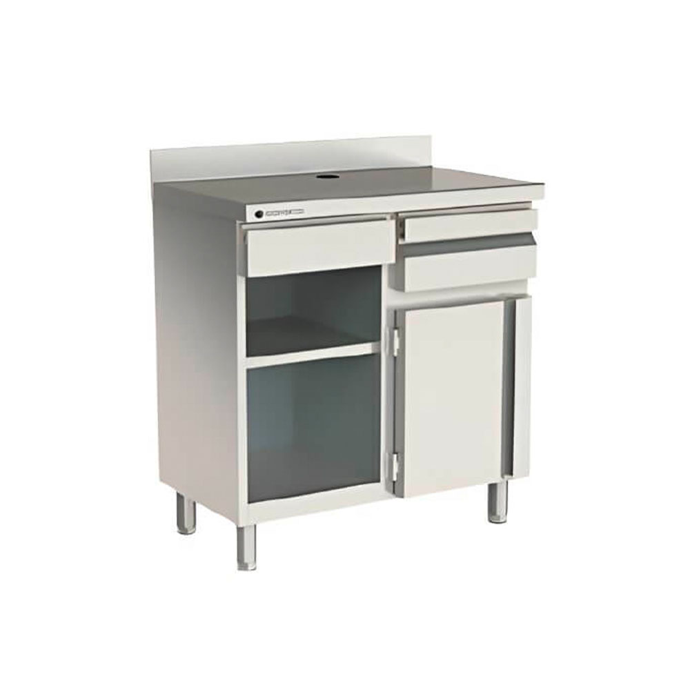 El Mc-100-2 incluye cajones auxiliares con guías de rodamientos, que permiten un acceso cómodo y duradero, y una tolva para café con golpeador, debido a que se ha pensado para un uso profesional e intensivo. También incorpora dos estantes intermedios, perfectos para el almacenamiento organizado de utensilios o ingredientes.