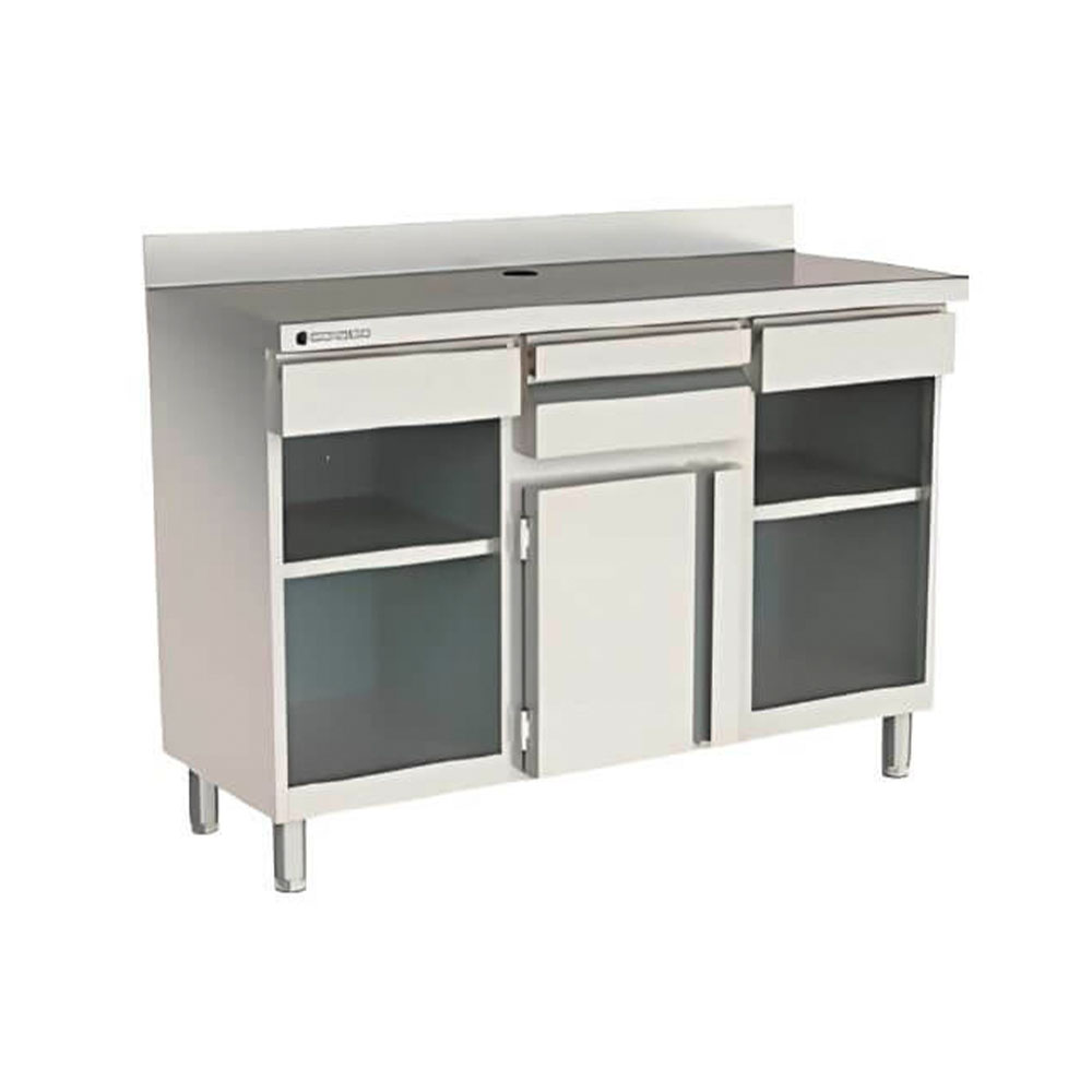 Siendo eso esencial en entornos de alto tránsito como cafeterías, bares y restaurantes, este modelo ofrece una encimera con frente recto y peto sanitario trasero de 100 mm, especialmente útil para evitar salpicaduras. Es decir, garantiza un entorno más limpio y seguro para la preparación de bebidas calientes. Además, puede fabricarse sin peto, según la necesidad del cliente.