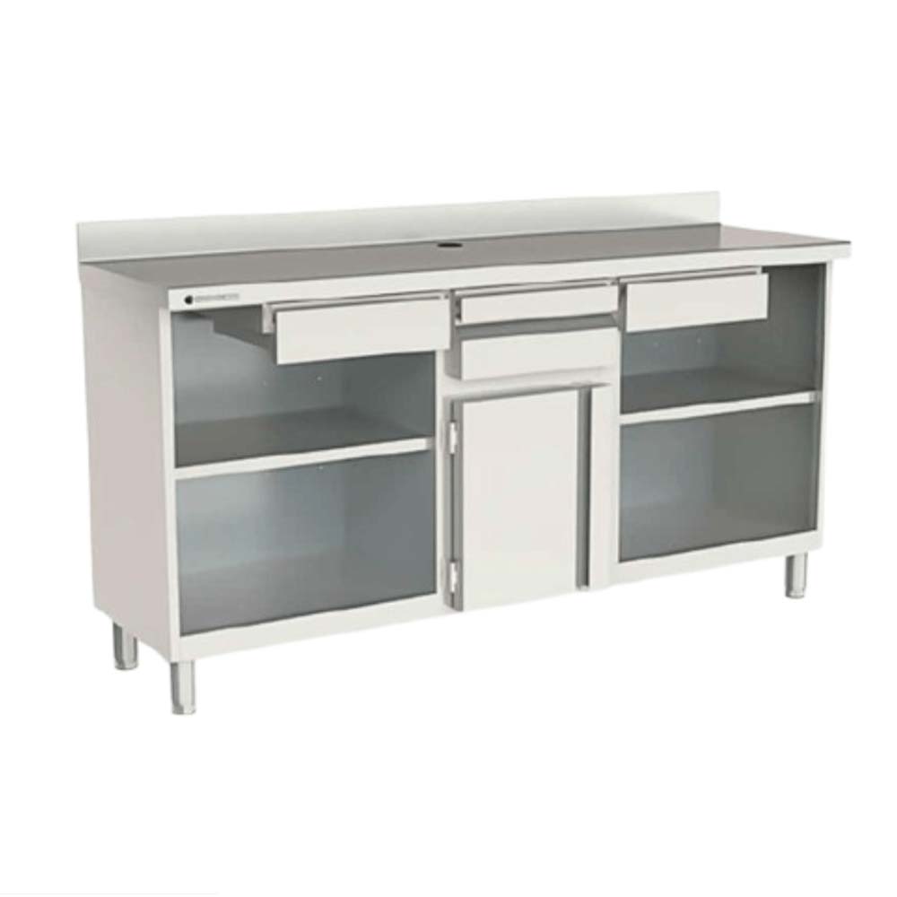 Después, su respaldo en acero plastificado aporta resistencia adicional sin perder la estética del conjunto. Por esta razón, es ideal para instalaciones visibles al cliente. Así como su estructura robusta y sus pies ajustables en altura (135-210 mm), el mostrador puede fabricarse a medida, adaptándose a distintos espacios y necesidades específicas.